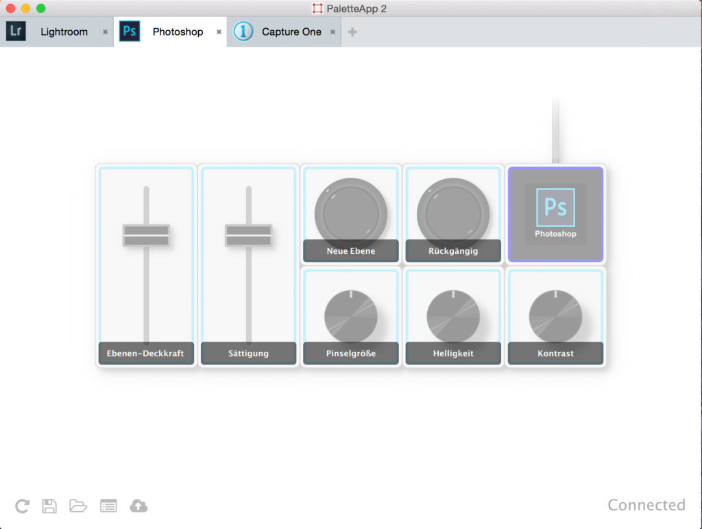 Für meine Lightroom-Basis-Konfiguration konnte ich alle Elemente mit vordefinierten Funktionen belegen. Da sich in der Palette-App allerdings für Photoshop recht wenige dieser Befehle finden, habe ich in einem für Porträt-Retusche erstellten Profil einige Tastaturkürzel hinterlegt. Für die beiden Taster beispielsweise CMD + J zum Erstellen einer neuen Ebene und Umschalt + Alt + F zum Auswählen der Füllmethode ›weiches Licht‹. Einen der beiden Schieberegler konnte ich für die Deckkraft der neuen Ebene nutzen. Die drei Drehregler nutze ich für das Anpassen der Pinselgröße, des Kontrasts und der Helligkeit. Dank der sensiblen Mechanik der Drehregler lässt sich ein Bild damit aber auch sehr präzise gerade ausrichten.