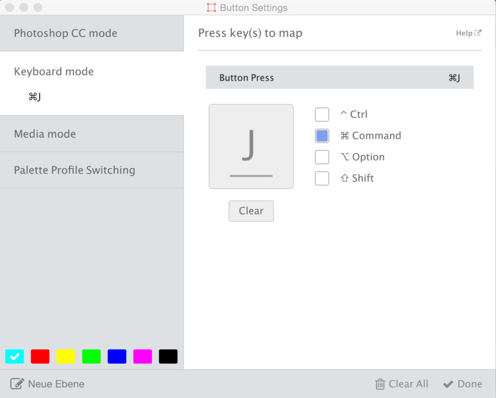 Beim Erstellen eines Profils zeigt die App die Elemente in genau der Anordnung, in der man sie zusammengesteckt hat (Abb. 4 und 5). Es lässt sich für jedes Element aus einer Vielzahl vordefinierter Funktionen wählen. Ist die gewünschte Funktion nicht schon in der App hinterlegt, kann man diese über die Tastenkürzel (sofern ein Tastenkürzel für die Funktion vorhanden ist) manuell belegen. Daraus ergeben sich unzählige Möglichkeiten, wenn man bedenkt, wie viele Funktion sich über Tastenbefehle ausführen lassen.
