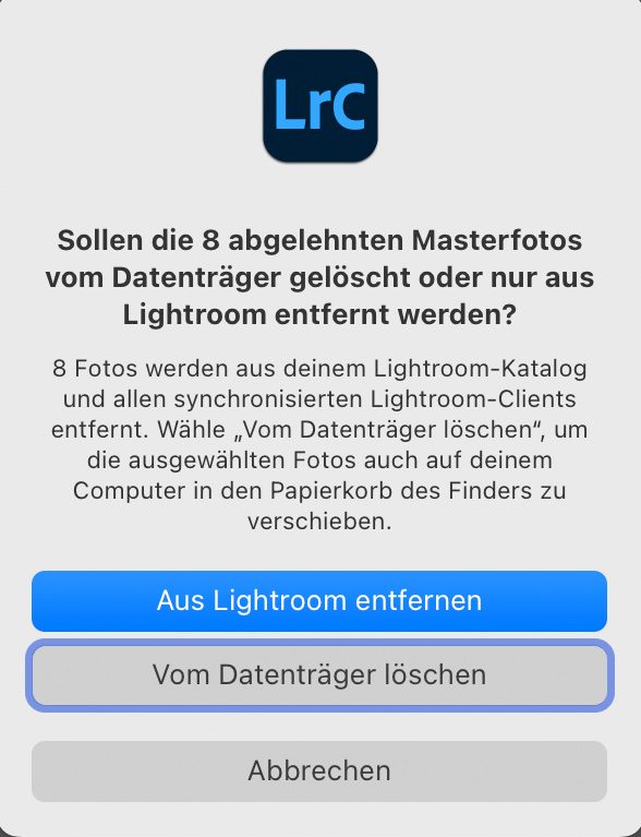 Die ›vom Datenträger gelöschten‹ Bilder landen damit im System-Papierkorb und können zur Not von dort zurückgeholt werden; die Lightroom-Bearbeitung ist dabei aber verloren, da sie im Normalfall nur im Katalog von Lightroom Classic liegt und von dort gelöscht wurde.