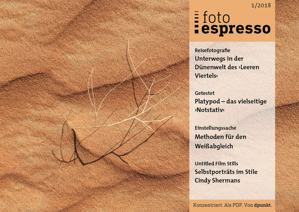 Verpassen Sie keine Neuerscheinungen mehr! abonnieren fotoespresso ist ein kostenfreies Magazin für ambitionierte Fotografen. Von der Technik bis zu Einblicken in die verschiedenen Genres behandelt es die ganze Themenvielfalt der Fotografie. Dabei liefert fotoespresso aber keine ›news in a nutshell‹, sondern unabhängige Beiträge mit fachlicher Tiefe. Wie der Espresso im Namen, so der Inhalt des Magazins: konzentriert, stark und dennoch bekömmlich.