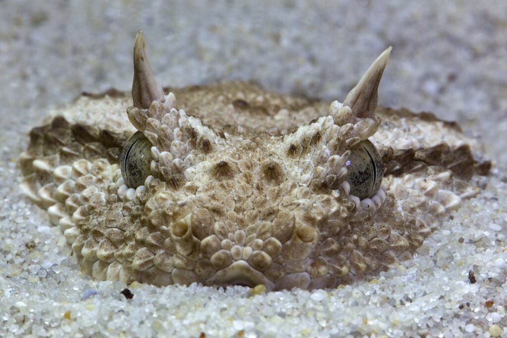 Die Hornviper in Abb. 11 habe ich bei mittlerer Blende fotografiert. Dadurch verteilte sich der Schärfebereich so weit im Bild, dass die Aufmerksamkeit des Betrachters auf die Augen gelenkt wurde, aber noch mehr Detailreichtum des Kopfes zu erkennen war. Die Unschärfe im übrigen Bild verstärkte diesen Eindruck.