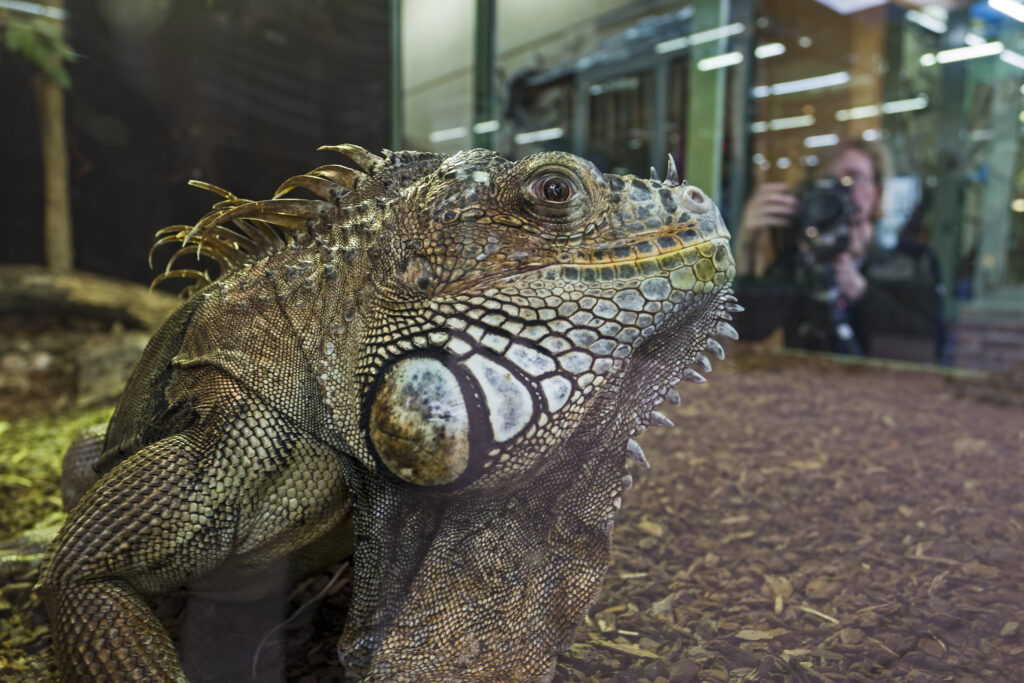 Tiere hinter Glas stellen beim Fotografieren immer eine besondere Herausforderung dar. Besonders störend sind Spiegelungen oder Menschen im Hintergrund. Oft ist man aber selbst Grund des Ärgernisses, nämlich wenn man die falsche Kleidung trägt! Diese sollte dunkel sein und keine hellen Aufdrucke haben! Ansonsten könnte ein ungewolltes Selfie dabei herauskommen. Aber das Wichtigste ist: kein Blitz! Der macht wegen der Glasscheiben ohnehin keinen Sinn und hat in einem Zoo grundsätzlich nichts zu suchen. Terrarien sind oft mit unterschiedlichen Lampentypen ausgestattet, die unterschiedliche Lichtspektren aufweisen. Das ist kein Problem, wenn man im RAW-Format fotografiert. Der Weißabgleich lässt sich später am Computer optimal korrigieren.