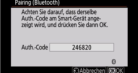 Danach verbinden sich Z 50 und »SnapBridge« – die Z 50 ist nun auf Ihrem Mobilgerät registriert (siehe dort die »Bluetooth«-Einstellungen) und umgekehrt Ihr Mobilgerät in der Z 50. Sollte die Koppelung scheitern, wiederholen Sie die Schritte und achten Sie darauf, dass Sie am Ende gleichzeitig die beiden »OK«-Tasten drücken.