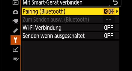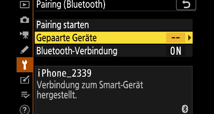 Wenn im SnapBridge-Menü »Automatische Verknüpfung« auf »Ein« steht und Sie der Kamera im Menü »SYSTEM« -> »Mit Smartgerät verbinden« -> »Pairing Bluetooth« Bluetooth einschalten, braucht es immer nur ein paar Sekunden zum automatischen Wiederaufbau der Bluetooth-Verbindung (wie das genau funktioniert, lesen Sie im folgenden Beispiel).