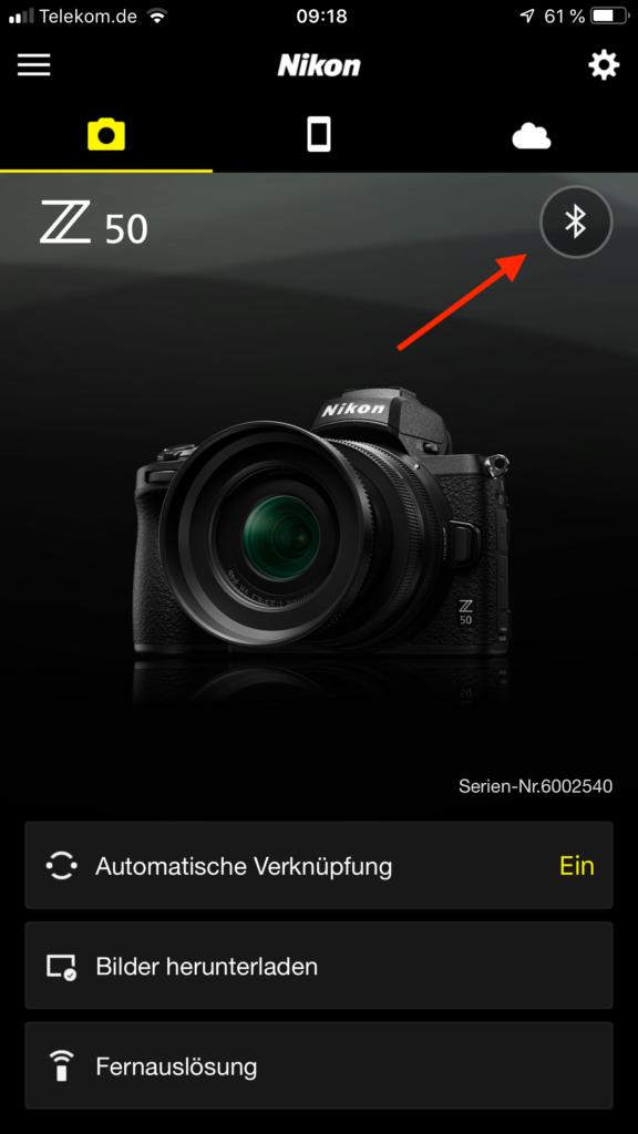 Ob die Verbindung steht, erkennen Sie in »SnapBridge« auch am Bluetooth-Symbol rechts oberhalb der Kamera. Tippen Sie das Symbol gegebenenfalls an, um die Verbindung aufzubauen.