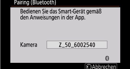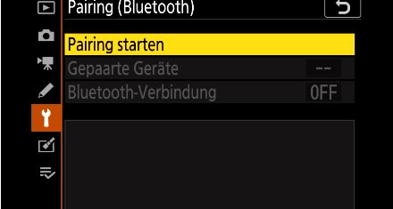 Gehen Sie in der Z 50 im Menü »Mit Smart-Gerät verbinden« auf den Punkt »Pairing (Bluetooth)« und aktivieren Sie darin »Pairing starten« (indem Sie mit dem Multifunktionswähler nach rechts klicken).