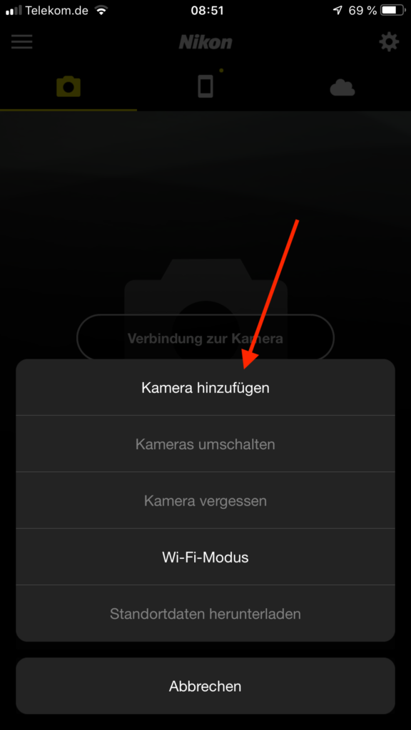 SnapBridge zeigt Ihnen eine zweite Liste, in der Sie abermals den Eintrag mit der Kamera antippen.